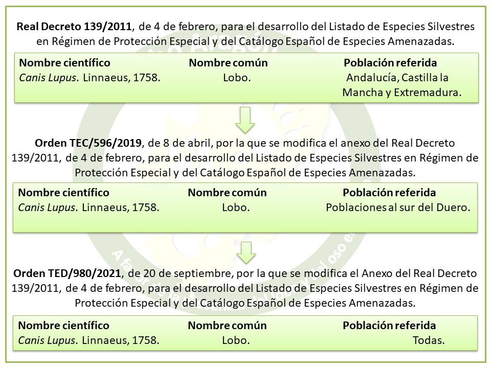 De este modo, teniendo en cuenta que tanto el Listado como el Catálogo son herramientas dinámicas y sujetas a actualización permanente, la Dirección General de Biodiversidad, Bosques y Desertificación del Ministerio para la Transición Ecológica y el Reto Demográfico recibió y tramitó una propuesta proveniente de la Asociación para la Conservación y Estudio del Lobo Ibérico (ASCEL) para la inclusión de todas las poblaciones del Lobo (Canis lupus) presentes en España en el Catálogo en la categoría «Vulnerable» o, en su defecto, en el Listado.